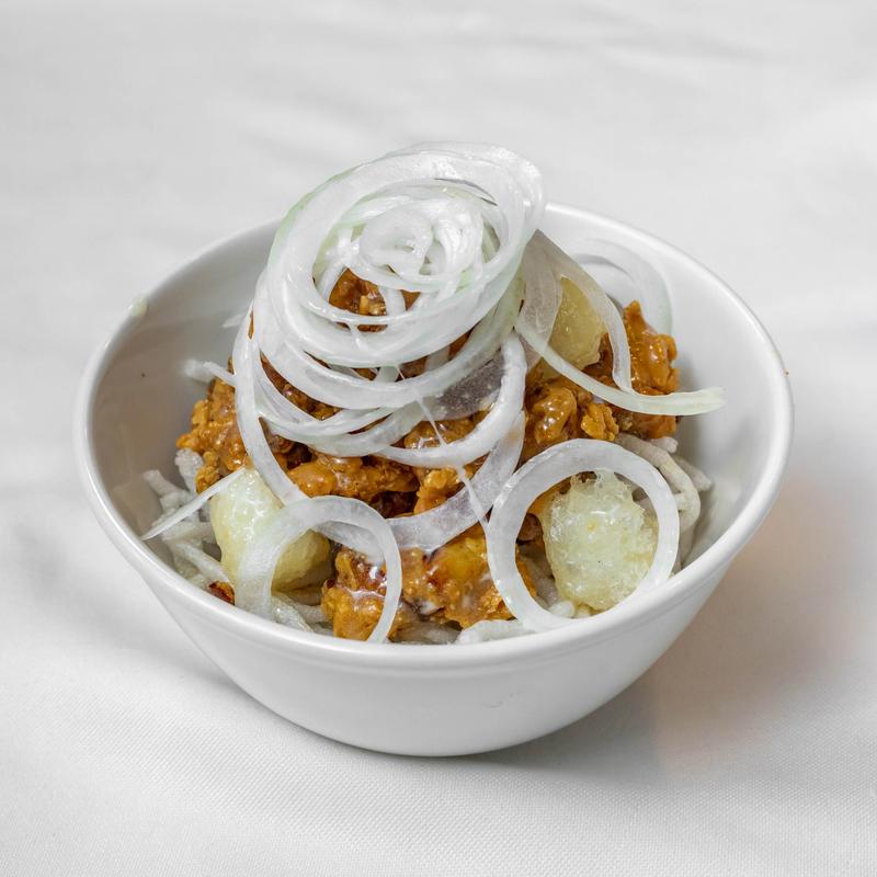 Small $13.00 | Large $23.00 | XL Family size $33.00 • Crispy boneless chicken leg with thinly sliced onion with onion cream and rice cake.