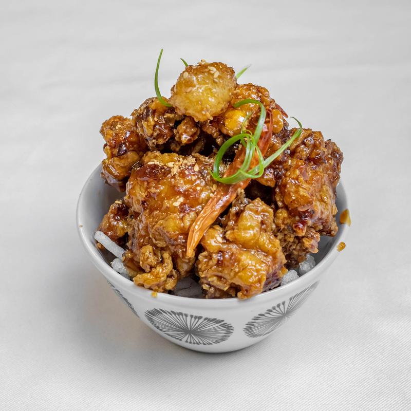 Small $13.00 | Large $23.00 | XL Family size $33.00 • Crispy boneless chicken leg with honey mustard glaze and rice cake.